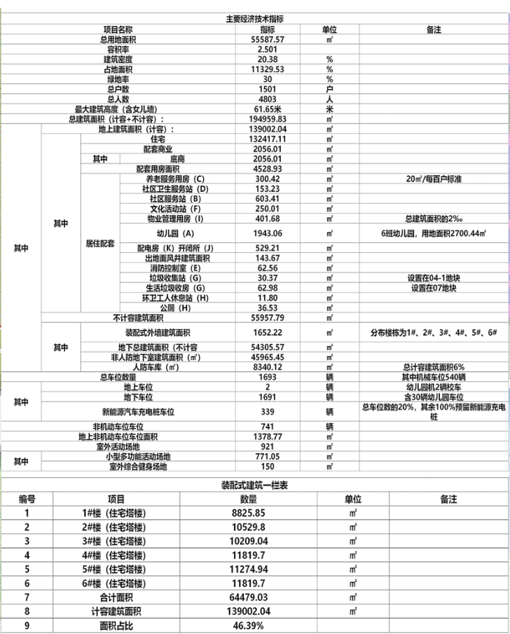 根據(jù)規(guī)劃示意圖可知,其居住項(xiàng)目總用地面積55587.57平方米,總建筑面積194959.83平方米,共12棟住宅樓,有1501戶,其中1-6#住宅樓采用裝配建筑,整個(gè)居住項(xiàng)目容積率2.501,建筑密度20.38%。