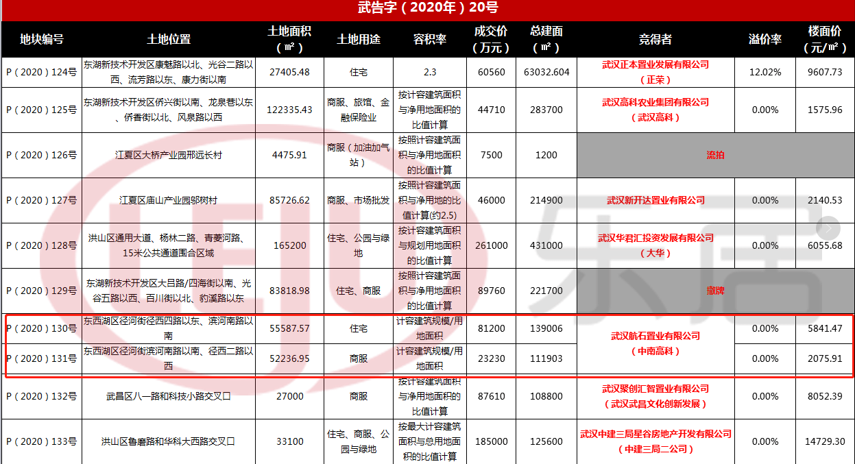 2020年11月26日,武漢航石置業(yè)有限公司以底價(jià)104430萬(wàn)元(宅地+商服23230萬(wàn)元)競(jìng)得東西湖臨空港P(2020)130號(hào)地塊&P(2020)131號(hào)地塊兩宗地塊,其中P(2020)130號(hào)住宅地塊拿地總價(jià)81200萬(wàn)元,樓面地價(jià)5841.47元/平,P(2020)131號(hào)商服地塊,拿地總價(jià)23230萬(wàn)元,樓面地價(jià)2075.91元/平。