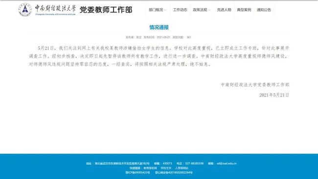 5月21日下午,中南財經(jīng)政法大學(xué)黨委教師工作部發(fā)布通報稱,經(jīng)初步核查,決定即日起先暫停該教師所有教學(xué)工作,進行進一步調(diào)查。中南財經(jīng)政法大學(xué)高度重視師德師風(fēng)建設(shè),對師德師風(fēng)違規(guī)問題堅持零容忍的態(tài)度,一經(jīng)查實,將按照相關(guān)法規(guī)嚴肅處理,絕不姑息。