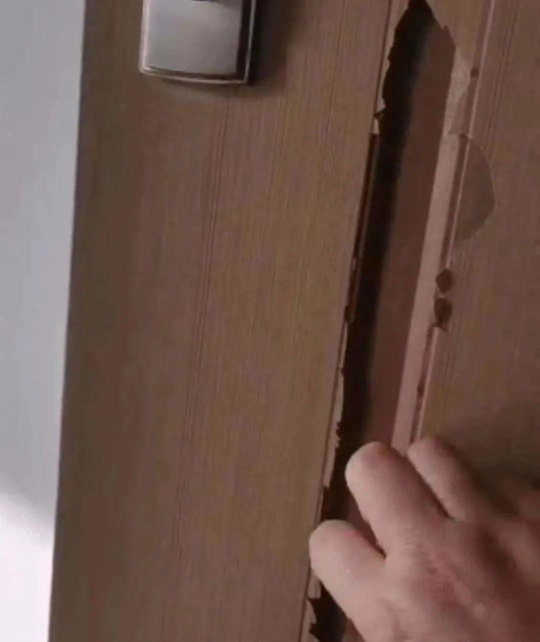 從公眾號發(fā)布視頻截圖中可以看到,一名業(yè)主從木門破裂處輕輕撕拽木門貼皮,結果這木門的貼皮竟然像紙片一樣被輕松撕下,露出粗糙的內芯。