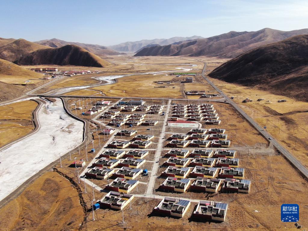 這是1月11日拍攝的青海省果洛藏族自治州甘德縣上貢麻鄉(xiāng)隆亞村搬遷點全貌(無人機(jī)照片)。新華社記者 張龍 攝