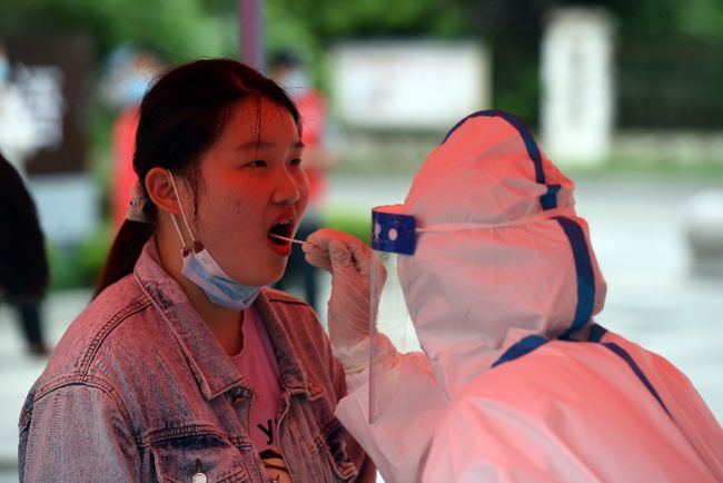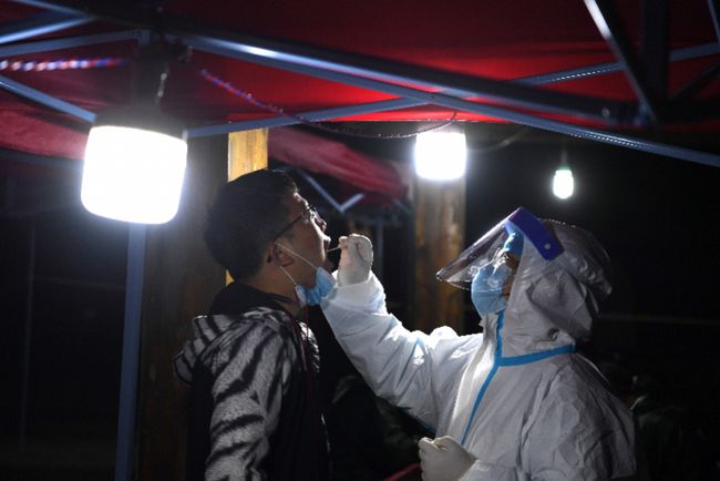 5月15日,在六安市裕安區(qū)和順社區(qū),醫(yī)護人員為居民做核酸檢測。新華社發(fā)